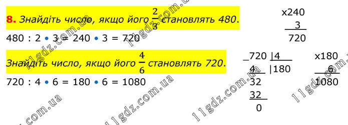 8. Знайдіть число, якщо його 2/3 становлять 480. 480 : 2 • 3 = 240 • 3 = 720 Знайдіть число, якщо його 4/6 становлять 720. 720 : 4 • 6 = 180 • 6 = 1080