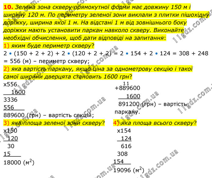 Зелена зона скверу прямокутної форми має довжину 150 м і ширину 120 м. По периметру зеленої зони виклали з плитки пішохідну доріжку, ширина якої 1 м. На відстані 1 м від зовнішнього боку доріжки мають установити паркан навколо скверу. Виконайте необхідні обчислення, щоб дати відповіді на запитання: 1) яким буде периметр скверу? 2 • (150 + 2 + 2) + 2 • (120 + 2 + 2) = 2 • 154 + 2 • 124 = 308 + 248 = 556 (м) – периметр скверу; 2) яка вартість паркану, якщо ціна за однометрову секцію і такої самої ширини дверцята становить 1600 грн?