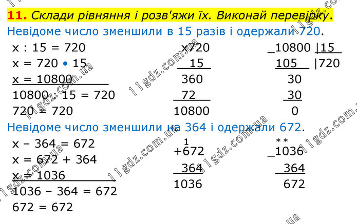 Склади рівняння і розв'яжи їх. Виконай перевірку. Невідоме число зменшили в 15 разів і одержали 720. х : 15 = 720 х = 720 • 15 х = 10800_____ 10800 : 15 = 720 720 = 720Невідоме число зменшили на 364 і одержали 672. х – 364 = 672 х = 672 + 364 х = 1036_______ 1036 – 364 = 672 672 = 672