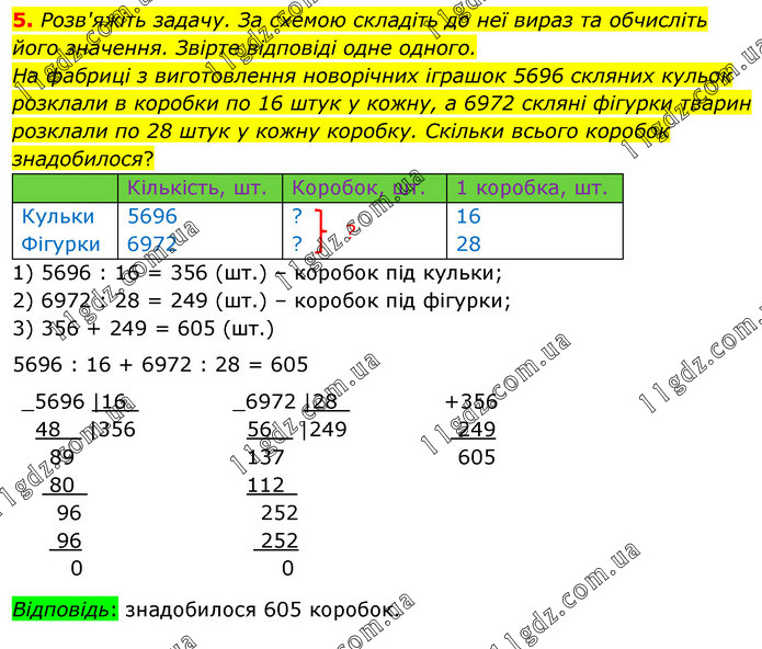 Розв'яжіть задачу. За схемою складіть до неї вираз та обчисліть його значення. Звірте відповіді одне одного. На фабриці з виготовлення новорічних іграшок 5696 скляних кульок розклали в коробки по 16 штук у кожну, а 6972 скляні фігурки тварин розклали по 28 штук у кожну коробку. Скільки всього коробок знадобилося? 1) 5696 : 16 = 356 (шт.) – коробок під кульки; 2) 6972 : 28 = 249 (шт.) – коробок під фігурки; 3) 356 + 249 = 605 (шт.) 5696 : 16 + 6972 : 28 = 605 Відповідь: знадобилося 605 коробок.