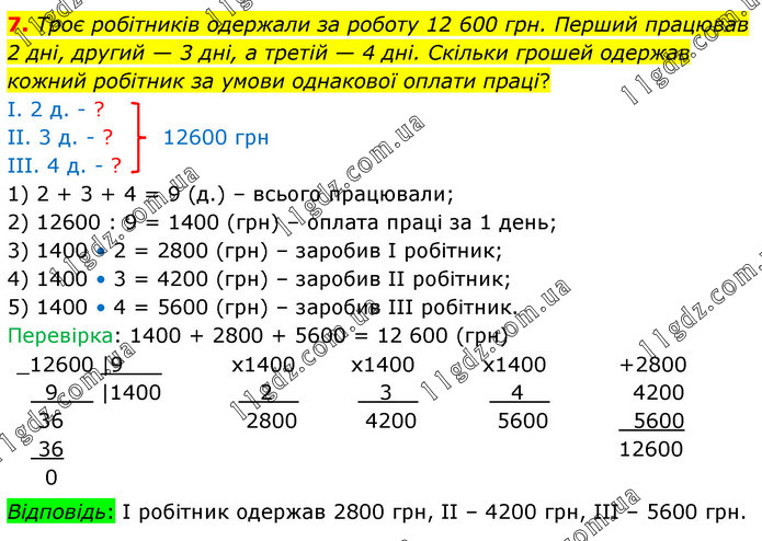 Троє робітників одержали за роботу 12 600 грн. Перший працював 2 дні, другий — 3 дні, а третій — 4 дні. Скільки грошей одержав кожний робітник за умови однакової оплати праці? І. 2 д. - ? ІІ. 3 д. - ? 12600 грн ІІІ. 4 д. - ? 1) 2 + 3 + 4 = 9 (д.) – всього працювали; 2) 12600 : 9 = 1400 (грн) – оплата праці за 1 день; 3) 1400 • 2 = 2800 (грн) – заробив І робітник; 4) 1400 • 3 = 4200 (грн) – заробив ІІ робітник; 5) 1400 • 4 = 5600 (грн) – заробив ІІІ робітник. Перевірка: 1400 + 2800 + 5600 = 12 600 (грн)