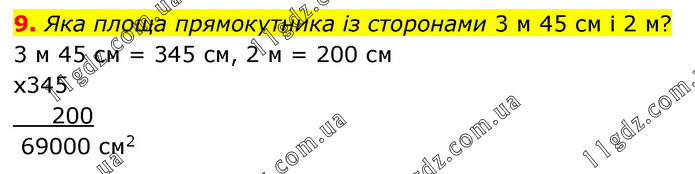 Яка площа прямокутника із сторонами 3 м 45 см і 2 м? 3 м 45 см = 345 см, 2 м = 200 см