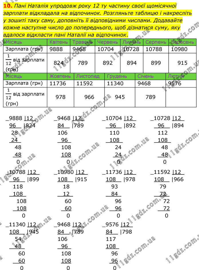 Пані Наталія упродовж року 12 ту частину своєї щомісячної зарплати відкладала на відпочинок. Розгляньте таблицю і накресліть у зошиті таку саму, доповніть її відповідними числами. Додавайте кожне наступне число до попереднього, щоб дізнатися суму, яку вдалося відкласти пані Наталії на відпочинок.