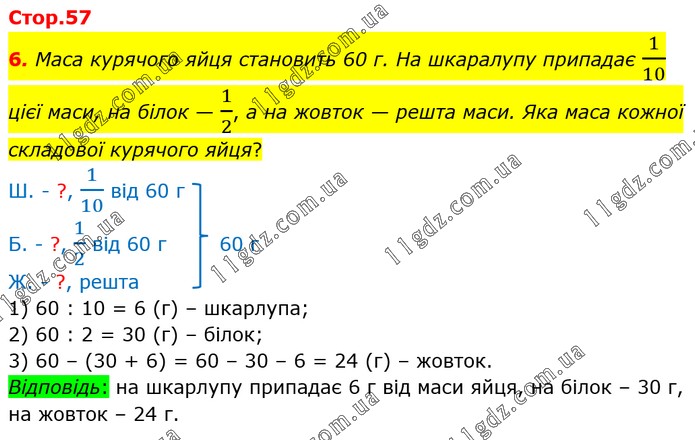 Маса курячого яйця становить 60 г. На шкаралупу припадає 1/10 цієї маси, на білок — 1/2, а на жовток — решта маси. Яка маса кожної складової курячого яйця? Ш. - ?, 1/10 від 60 г Б. - ?, 1/2 від 60 г 60 г Ж. - ?, решта 1) 60 : 10 = 6 (г) – шкарлупа; 2) 60 : 2 = 30 (г) – білок; 3) 60 – (30 + 6) = 60 – 30 – 6 = 24 (г) – жовток. Відповідь: на шкарлупу припадає 6 г від маси яйця, на білок – 30 г, на жовток – 24 г.