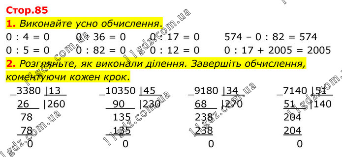 1. Виконайте усно обчислення. 0 : 4 = 0 0 : 5 = 0 0 : 36 = 0 0 : 82 = 0 0 : 17 = 0 0 : 12 = 0 574 – 0 : 82 = 574 0 : 17 + 2005 = 2005 2. Розгляньте, як виконали ділення. Завершіть обчислення, коментуючи кожен крок.
