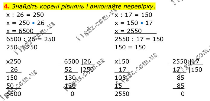 Знайдіть корені рівнянь і виконайте перевірку. х : 26 = 250 х = 250 • 26 х = 6500_____ 6500 : 26 = 250 250 = 250 х : 17 = 150 х = 150 • 17 х = 2550____ 2550 : 17 = 150 150 = 150