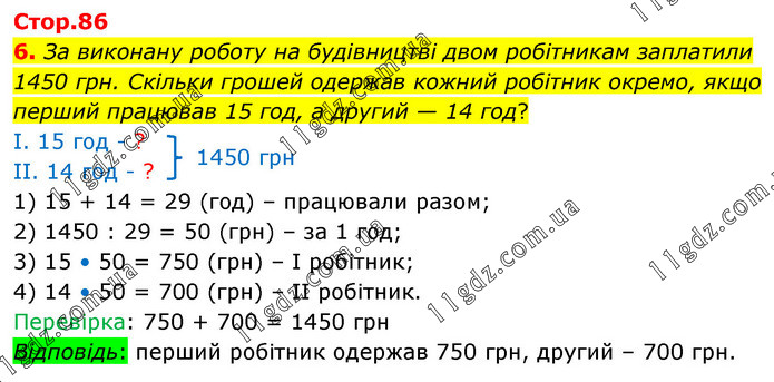За виконану роботу на будівництві двом робітникам заплатили 1450 грн. Скільки грошей одержав кожний робітник окремо, якщо перший працював 15 год, а другий — 14 год? І. 15 год - ? ІІ. 14 год - ? 1) 15 + 14 = 29 (год) – працювали разом; 2) 1450 : 29 = 50 (грн) – за 1 год; 3) 15 • 50 = 750 (грн) – І робітник; 4) 14 • 50 = 700 (грн) – ІІ робітник. Перевірка: 750 + 700 = 1450 грн Відповідь: перший робітник одержав 750 грн, другий – 700 грн.