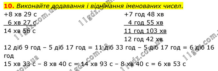 Виконайте додавання і віднімання іменованих чисел. 12 діб 9 год – 5 діб 17 год = 11 діб 33 год – 5 діб 17 год = 6 діб 16 год 15 хв 33 с – 8 хв 40 с = 14 хв 93 с – 8 хв 40 с = 6 хв 53 с