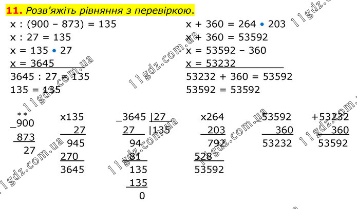 Розв'яжіть рівняння з перевіркою. х : (900 – 873) = 135 х : 27 = 135 х = 135 • 27 х = 3645_____ 3645 : 27 = 135 135 = 135 х + 360 = 264 • 203 х + 360 = 53592 х = 53592 – 360 х = 53232________ 53232 + 360 = 53592 53592 = 53592