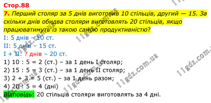 Перший столяр за 5 днів виготовив 10 стільців, другий — 15. За скільки днів обидва столяри виготовлять 20 стільців, якщо працюватимуть із такою самою продуктивністю? І: 5 днів – 10 ст. ІІ: 5 днів – 15 ст. І + ІІ: ? днів – 20 ст. 1) 10 : 5 = 2 (ст.) – за 1 день І столяр; 2) 15 : 5 = 3 (ст.) – за 1 день ІІ столяр; 3) 2 + 3 = 5 (ст.) – за 1 день разом; 4) 20 : 5 = 4 (дні) Відповідь: 20 стільців столяри виготовлять за 4 дні.