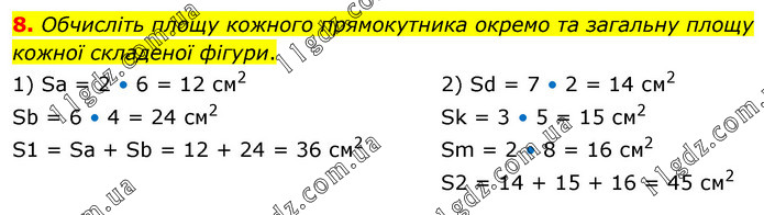 8. Обчисліть площу кожного прямокутника окремо та загальну площу кожної складеної фігури. 1) Sa = 2 • 6 = 12 см2 Sb = 6 • 4 = 24 см2 S1 = Sa + Sb = 12 + 24 = 36 см2 2) Sd = 7 • 2 = 14 см2 Sk = 3 • 5 = 15 см2 Sm = 2 • 8 = 16 см2 S2 = 14 + 15 + 16 = 45 см2