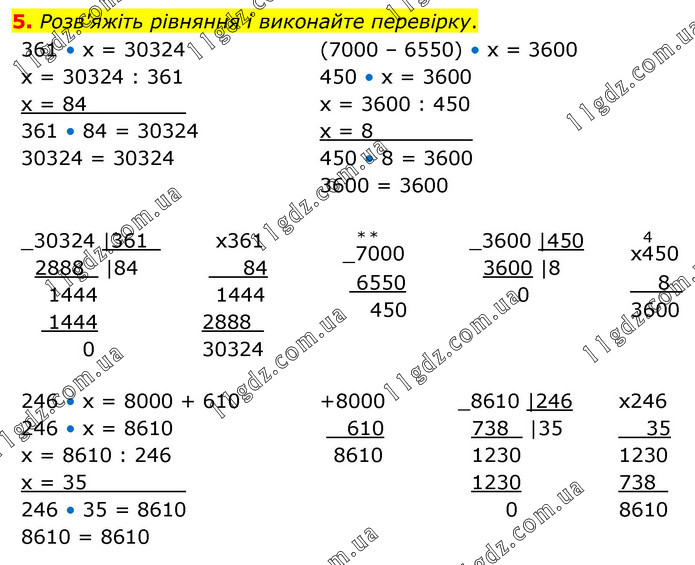 Розв'яжіть рівняння і виконайте перевірку. 361 • х = 30324 х = 30324 : 361 х = 84________ 361 • 84 = 30324 30324 = 30324 (7000 – 6550) • х = 3600 450 • х = 3600 х = 3600 : 450 х = 8________ 450 • 8 = 3600 3600 = 3600 246 • х = 8000 + 610 246 • х = 8610 х = 8610 : 246 х = 35________ 246 • 35 = 8610 8610 = 8610