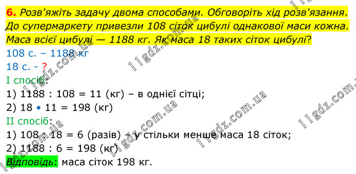 Розв'яжіть задачу двома способами. Обговоріть хід розв'язання. До супермаркету привезли 108 сіток цибулі однакової маси кожна. Маса всієї цибулі — 1188 кг. Як маса 18 таких сіток цибулі? 108 с. – 1188 кг 18 с. - ? І спосіб: 1) 1188 : 108 = 11 (кг) – в однієї сітці; 2) 18 • 11 = 198 (кг) ІІ спосіб: 1) 108 : 18 = 6 (разів) – у стільки менше маса 18 сіток; 2) 1188 : 6 = 198 (кг) Відповідь: маса сіток 198 кг.