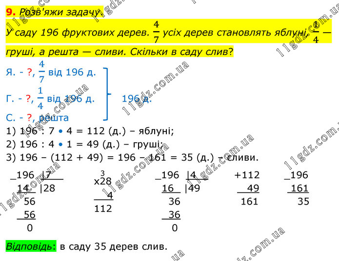 Розв'яжи задачу. У саду 196 фруктових дерев. 4/7 усіх дерев становлять яблуні, 1/4 — груші, а решта — сливи. Скільки в саду слив? Я. - ?, 4/7 від 196 д. Г. - ?, 1/4 від 196 д. 196 д. С. - ?, решта 1) 196 : 7 • 4 = 112 (д.) – яблуні; 2) 196 : 4 • 1 = 49 (д.) – груші; 3) 196 – (112 + 49) = 196 – 161 = 35 (д.) – сливи.