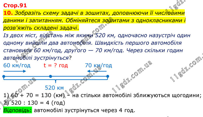 Зобразіть схему задачі в зошитах, доповнюючи її числовими даними і запитанням. Обміняйтеся зошитами з однокласниками і розв'яжіть складені задачі. Із двох міст, відстань між якими 520 км, одночасно назустріч один одному вийшли два автомобіля. Швидкість першого автомобіля становила 60 км/год, другого — 70 км/год. Через скільки годин автомобілі зустрінуться? 1) 60 + 70 = 130 (км) – на стільки автомобілі зближуються щогодини; 2) 520 : 130 = 4 (год) Відповідь: автомобілі зустрінуться через 4 год.