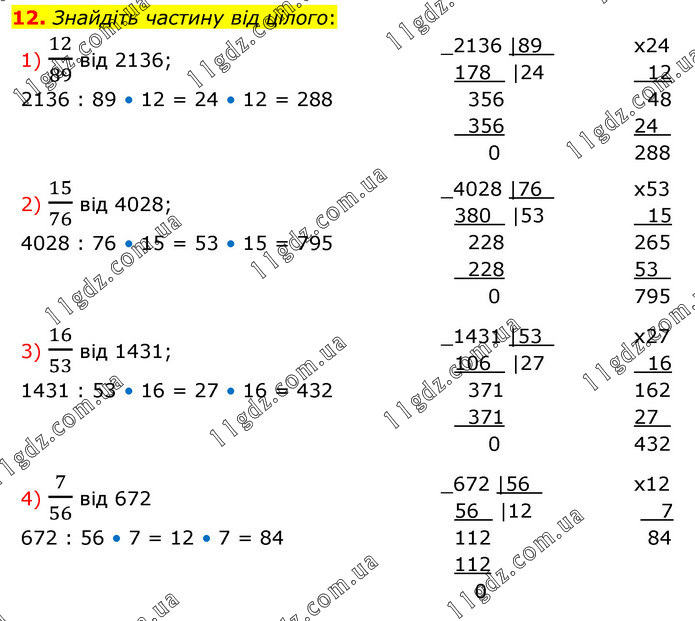 Знайдіть частину від цілого: 1) 12/89 від 2136; 2136 : 89 • 12 = 24 • 12 = 288; 2) 15/76 від 4028; 4028 : 76 • 15 = 53 • 15 = 795; 3) 16/53 від 1431; 1431 : 53 • 16 = 27 • 16 = 432; 4) 7/56 від 672 672 : 56 • 7 = 12 • 7 = 84