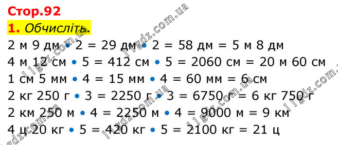 Обчисліть. 2 м 9 дм • 2 = 29 дм • 2 = 58 дм = 5 м 8 дм 4 м 12 см • 5 = 412 см • 5 = 2060 см = 20 м 60 см 1 см 5 мм • 4 = 15 мм • 4 = 60 мм = 6 см 2 кг 250 г • 3 = 2250 г • 3 = 6750 г = 6 кг 750 г 2 км 250 м • 4 = 2250 м • 4 = 9000 м = 9 км 4 ц 20 кг • 5 = 420 кг • 5 = 2100 кг = 21 ц