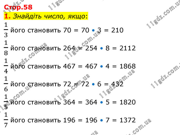 Знайдіть число, якщо: 1/3 його становить 70 = 70 • 3 = 210 1/8 його становить 264 = 254 • 8 = 2112 1/4 його становить 467 = 467 • 4 = 1868 1/6 його становить 72 = 72 • 6 = 432 1/5 його становить 364 = 364 • 5 = 1820 1/7 його становить 196 = 196 • 7 = 1372