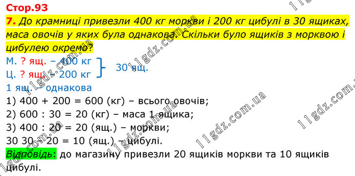 До крамниці привезли 400 кг моркви і 200 кг цибулі в 30 ящиках, маса овочів у яких була однакова. Скільки було ящиків з морквою і цибулею окремо? М. ? ящ. – 400 кг Ц. ? ящ. – 200 кг 1 ящ. – однакова 1) 400 + 200 = 600 (кг) – всього овочів; 2) 600 : 30 = 20 (кг) – маса 1 ящика; 3) 400 : 20 = 20 (ящ.) – моркви; 30 30 – 20 = 10 (ящ.) – цибулі. Відповідь: до магазину привезли 20 ящиків моркви та 10 ящиків цибулі.