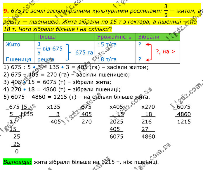 675 га землі засіяли різними культурними рослинами: 3/5 — житом, а решту — пшеницею. Жита зібрали по 15 т з гектара, а пшениці — по 18 т. Чого зібрали більше і на скільки? 1) 675 : 5 • 3 = 135 • 3 = 405 (га) – засіяли житом; 2) 675 – 405 = 270 (га) – засіяли пшеницею; 3) 405 • 15 = 6075 (т) – зібрали жита; 4) 270 • 18 = 4860 (т) – зібрали пшениці; 5) 6075 – 4860 = 1215 (т) – на стільки більше жита. Відповідь: жита зібрали більше на 1215 т, ніж пшениці.