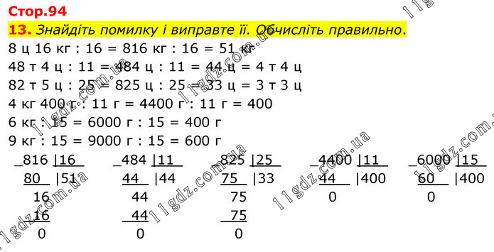Знайдіть помилку і виправте її. Обчисліть правильно. 8 ц 16 кг : 16 = 816 кг : 16 = 51 кг 48 т 4 ц : 11 = 484 ц : 11 = 44 ц = 4 т 4 ц 82 т 5 ц : 25 = 825 ц : 25 = 33 ц = 3 т 3 ц 4 кг 400 г : 11 г = 4400 г : 11 г = 400 6 кг : 15 = 6000 г : 15 = 400 г 9 кг : 15 = 9000 г : 15 = 600 г