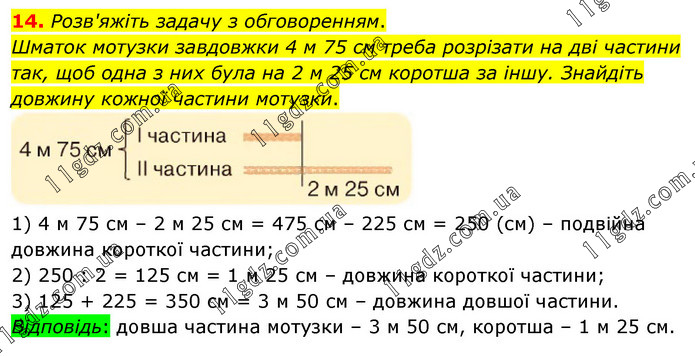 Розв'яжіть задачу з обговоренням. Шматок мотузки завдовжки 4 м 75 см треба розрізати на дві частини так, щоб одна з них була на 2 м 25 см коротша за іншу. Знайдіть довжину кожної частини мотузки. 1) 4 м 75 см – 2 м 25 см = 475 см – 225 см = 250 (см) – подвійна довжина короткої частини; 2) 250 : 2 = 125 см = 1 м 25 см – довжина короткої частини; 3) 125 + 225 = 350 см = 3 м 50 см – довжина довшої частини. Відповідь: довша частина мотузки – 3 м 50 см, коротша – 1 м 25 см.