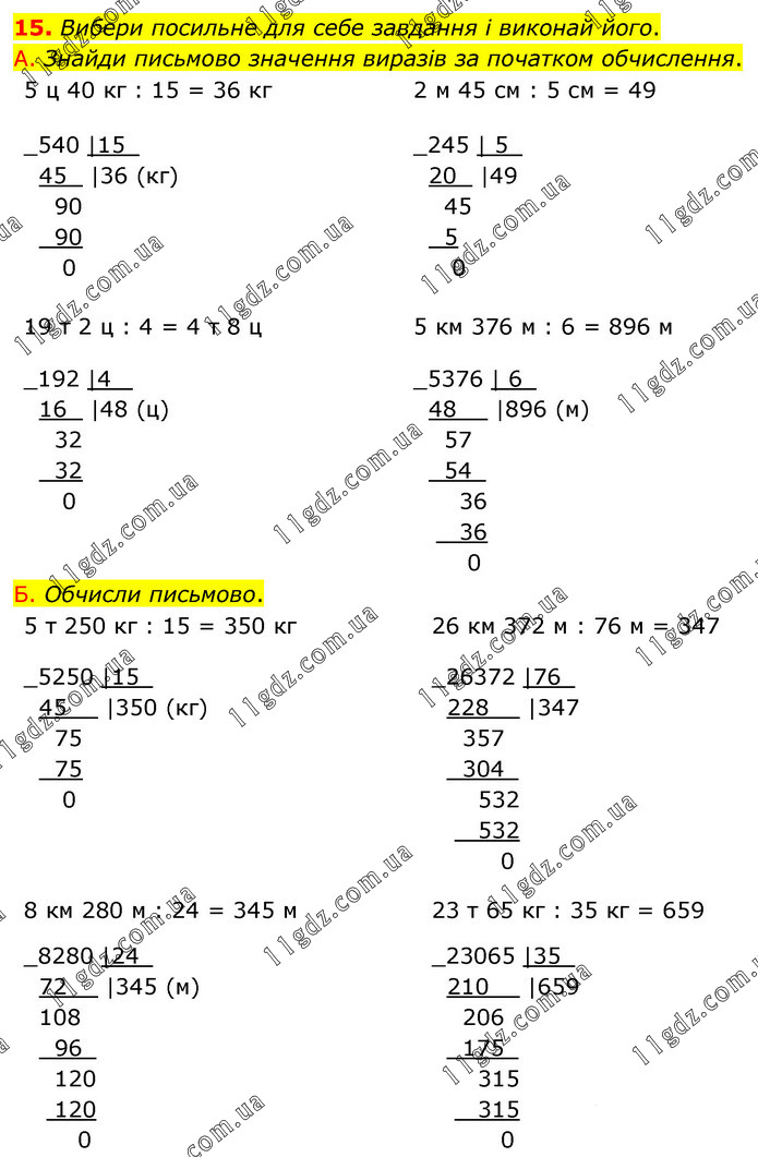 Вибери посильне для себе завдання і виконай його. А. Знайди письмово значення виразів за початком обчислення. 5 ц 40 кг : 15 = 36 кг ; 2 м 45 см : 5 см = 49; 19 т 2 ц : 4 = 4 т 8 ц; 5 км 376 м : 6 = 896 м; Обчисли письмово. 5 т 250 кг : 15 = 350 кг; 26 км 372 м : 76 м = 347; 8 км 280 м : 24 = 345 м ; 23 т 65 кг : 35 кг = 659