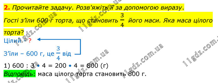 Прочитайте задачу. Розв'яжіть її за допомогою виразу. Гості з’їли 600 г торта, що становить 3/4 його маси. Яка маса цілого торта? Цілий - ? З’їли – 600 г, це 3/4 від 1) 600 : 3 • 4 = 200 • 4 = 800 (г) Відповідь: маса цілого торта становить 800 г.