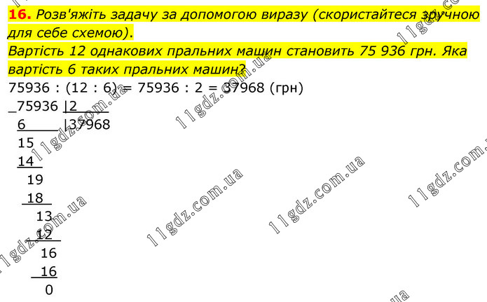 Розв'яжіть задачу за допомогою виразу (скористайтеся зручною для себе схемою). Вартість 12 однакових пральних машин становить 75 936 грн. Яка вартість 6 таких пральних машин? 75936 : (12 : 6) = 75936 : 2 = 37968 (грн)