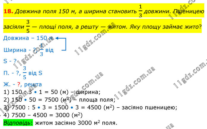 Довжина поля 150 м, а ширина становить 1/3 довжини. Пшеницею засіяли 3/5 — площі поля, а решту — житом. Яку площу займає жито? Довжина – 150 м Ширина - ?, 1/3 від S - ? П. - ?, 3/5 від S Ж. - ?, решта 1) 150 : 3 • 1 = 50 (м) – ширина; 2) 150 • 50 = 7500 (м2) – площа поля; 3) 7500 : 5 • 3 = 1500 • 3 = 4500 (м2) – засіяно пшеницею; 4) 7500 – 4500 = 3000 (м2) Відповідь: житом засіяно 3000 м2 поля.