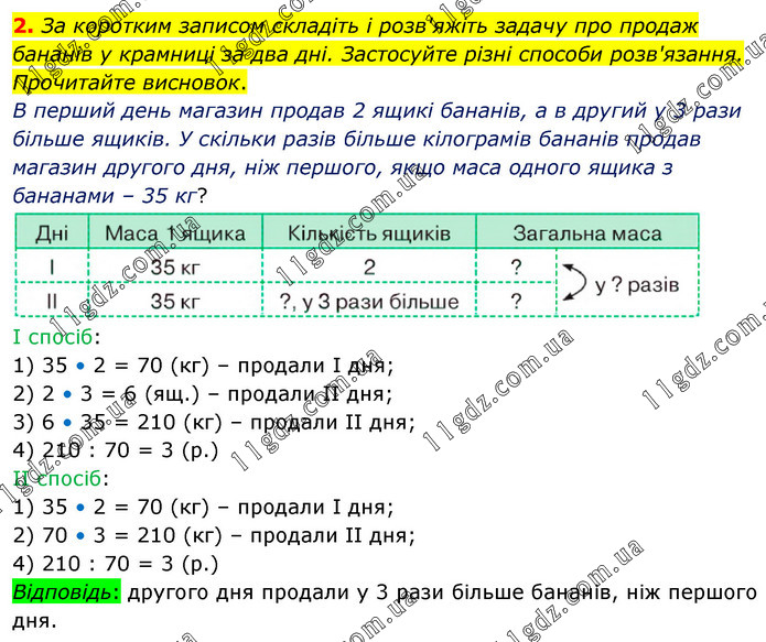 За коротким записом складіть і розв'яжіть задачу про продаж бананів у крамниці за два дні. Застосуйте різні способи розв'язання. Прочитайте висновок. В перший день магазин продав 2 ящикі бананів, а в другий у 3 рази більше ящиків. У скільки разів більше кілограмів бананів продав магазин другого дня, ніж першого, якщо маса одного ящика з бананами – 35 кг? І спосіб: 1) 35 • 2 = 70 (кг) – продали І дня; 2) 2 • 3 = 6 (ящ.) – продали ІІ дня; 3) 6 • 35 = 210 (кг) – продали ІІ дня; 4) 210 : 70 = 3 (р.) ІІ спосіб: 1) 35 • 2 = 70 (кг) – продали І дня; 2) 70 • 3 = 210 (кг) – продали ІІ дня; 4) 210 : 70 = 3 (р.) Відповідь: другого дня продали у 3 рази більше бананів, ніж першого дня.