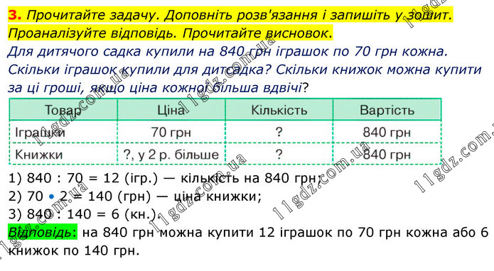 Прочитайте задачу. Доповніть розв'язання і запишіть у зошит. Проаналізуйте відповідь. Прочитайте висновок. Для дитячого садка купили на 840 грн іграшок по 70 грн кожна. Скільки іграшок купили для дитсадка? Скільки книжок можна купити за ці гроші, якщо ціна кожної більша вдвічі? 1) 840 : 70 = 12 (ігр.) — кількість на 840 грн; 2) 70 • 2 = 140 (грн) — ціна книжки; 3) 840 : 140 = 6 (кн.). Відповідь: на 840 грн можна купити 12 іграшок по 70 грн кожна або 6 книжок по 140 грн.