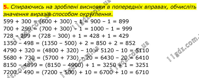 Спираючись на зроблені висновки в попередніх вправах, обчисліть значення виразів способом округлення. 599 + 300 = (600 + 300) – 1 = 900 – 1 = 899 700 + 299 = (700 + 300) – 1 = 1000 – 1 = 999 728 – 299 = (728 – 300) + 1 = 428 + 1 = 429 1350 – 498 = (1350 – 500) + 2 = 850 + 2 = 852 4790 + 320 = (4800 + 320) – 10 = 5120 – 10 = 5110 5680 + 730 = (5700 + 730) – 20 = 6430 – 20 = 6410 8150 – 4899 = (8150 – 4900) + 1 = 3250 + 1 = 3251 7200 – 490 = (7200 – 500) + 10 = 6700 + 10 = 6710