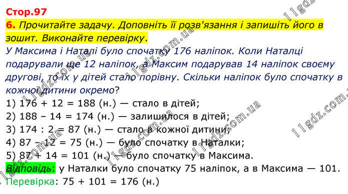 Прочитайте задачу. Доповніть її розв'язання і запишіть його в зошит. Виконайте перевірку. У Максима і Наталі було спочатку 176 наліпок. Коли Наталці подарували ще 12 наліпок, а Максим подарував 14 наліпок своєму другові, то їх у дітей стало порівну. Скільки наліпок було спочатку в кожної дитини окремо? 1) 176 + 12 = 188 (н.) — стало в дітей; 2) 188 – 14 = 174 (н.) — залишилося в дітей; 3) 174 : 2 = 87 (н.) — стало в кожної дитини; 4) 87 – 12 = 75 (н.) — було спочатку в Наталки; 5) 87 + 14 = 101 (н.) — було спочатку в Максима. Відповідь: у Наталки було спочатку 75 наліпок, а в Максима — 101. Перевірка: 75 + 101 = 176 (н.)