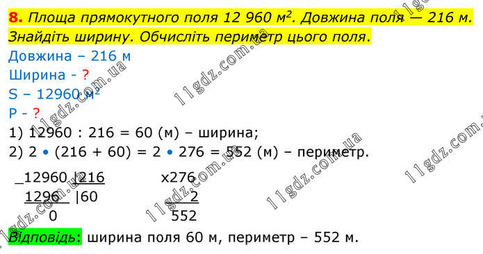 Площа прямокутного поля 12 960 м2. Довжина поля — 216 м. Знайдіть ширину. Обчисліть периметр цього поля. Довжина – 216 м Ширина - ? S – 12960 м2 Р - ? 1) 12960 : 216 = 60 (м) – ширина; 2) 2 • (216 + 60) = 2 • 276 = 552 (м) – периметр. Відповідь: ширина поля 60 м, периметр – 552 м.
