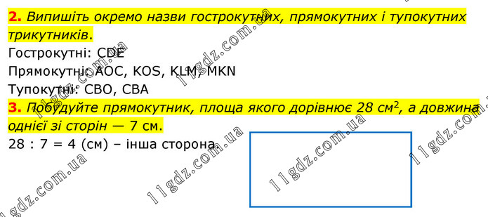 2. Випишіть окремо назви гострокутних, прямокутних і тупокутних трикутників. Гострокутні: CDE Прямокутні: AOC, KOS, KLM, MKN Тупокутні: CBO, CBA 3. Побудуйте прямокутник, площа якого дорівнює 28 см2, а довжина однієї зі сторін — 7 см. 28 : 7 = 4 (см) – інша сторона.