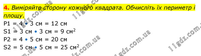 Виміряйте сторону кожного квадрата. Обчисліть їх периметр і площу. Р1 = 4 • 3 см = 12 см S1 = 3 см • 3 см = 9 см2 Р2 = 4 • 5 см = 20 см S2 = 5 см • 5 см = 25 см2