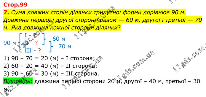 Сума довжин сторін ділянки трикутної форми дорівнює 90 м. Довжина першої і другої сторони разом — 60 м, другої і третьої — 70 м. Яка довжина кожної сторони ділянки? І - ? 90 м ІІ - ? ІІІ - ? 1) 90 – 70 = 20 (м) – І сторона; 2) 60 – 20 = 40 (м) – ІІ сторона; 3) 90 – 60 = 30 (м) – ІІІ сторона. Відповідь: довжина першої сторони 20 м, другої – 40 м, третьої – 30 м.