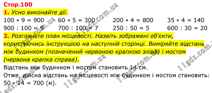1. Усно виконайте дії. 100 • 9 = 900 900 : 100 = 9 60 • 5 = 300 700 : 100 = 7 200 • 4 = 800 250 : 50 = 5 35 • 4 = 140 600 : 30 = 20 2. Розгляньте план місцевості. Назвіть зображені об'єкти, користуючись інструкцією на наступній сторінці. Виміряйте відстань між будинком (позначений червоною крапкою зліва) і мостом (червона крапка справа). Відстань між будинком і мостом становить 14 см. Отже, дійсна відстань на місцевості між будинком і мостом становить: 50 • 14 = 700 (м).