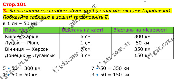 За вказаним масштабом обчисліть відстані між містами (приблизні). Побудуйте таблицю в зошиті та доповніть її. в 1 см – 50 км 5 • 50 = 300 км 1 • 50 = 50 км 7 • 50 = 350 км 3 • 50 = 150 км