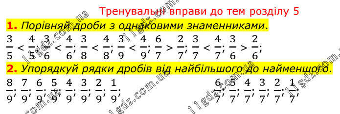 Тренувальні вправи до тем розділу 5 1. Порівняй дроби з однаковими знаменниками. 3/5 < 4/5; 3/6 < 4/6; 3/8 < 4/8; 3/9 < 4/9; 6/7 > 2/7; 3/7 < 4/7; 3/6 > 2/6; 2. Упорядкуй рядки дробів від найбільшого до найменшого. 8/9; 7/9; 6/9; 5/9; 4/9; 3/9; 2/9; 1/9; 6/7; 5/7; 4/7; 3/7; 2/7; 1/7;