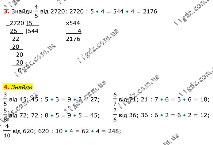 3. Знайди 4/5 від 2720; 2720 : 5 • 4 = 544 • 4 = 2176 4. Знайди 3/5 від 45; 45 : 5 • 3 = 9 • 3 = 27; 5/8 від 72; 72 : 8 • 5 = 9 • 5 = 45; 6/7 від 21; 21 : 7 • 6 = 3 • 6 = 18; 2/6 від 36; 36 : 6 • 2 = 6 • 2 = 12; 4/10 від 620; 620 : 10 • 4 = 62 • 4 = 248;