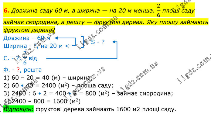 Довжина саду 60 м, а ширина — на 20 м менша. 2/6 площі саду займає смородина, а решту — фруктові дерева. Яку площу займають фруктові дерева? Довжина – 60 м Ширина - ?, на 20 м < С. - ?, 2/6 від Ф. - ?, решта 1) 60 – 20 = 40 (м) – ширина; 2) 60 • 40 = 2400 (м2) – площа саду; 3) 2400 : 6 • 2 = 400 • 2 = 800 (м2) – займає смородина; 4) 2400 – 800 = 1600 (м2) Відповідь: фруктові дерева займають 1600 м2 площі саду.