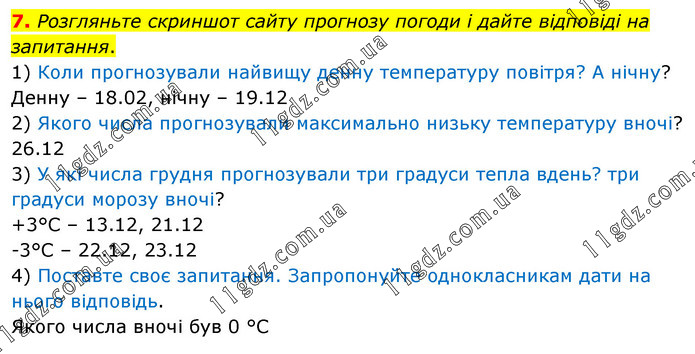 Розгляньте скриншот сайту прогнозу погоди і дайте відповіді на запитання. 1) Коли прогнозували найвищу денну температуру повітря? А нічну? Денну – 18.02, нічну – 19.12 2) Якого числа прогнозували максимально низьку температуру вночі? 26.12 3) У які числа грудня прогнозували три градуси тепла вдень? три градуси морозу вночі? +3°C – 13.12, 21.12 -3°C – 22.12, 23.12 4) Поставте своє запитання. Запропонуйте однокласникам дати на нього відповідь. Якого числа вночі був 0 °C
