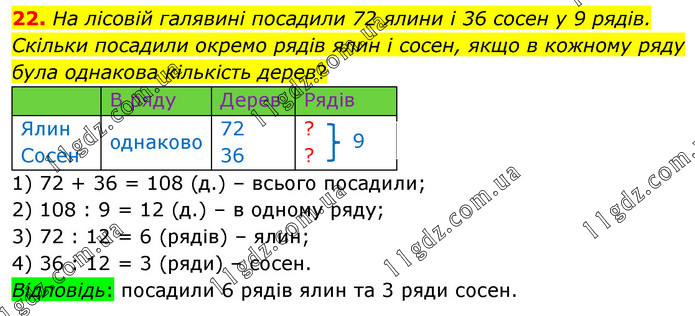 На лісовій галявині посадили 72 ялини і 36 сосен у 9 рядів. Скільки посадили окремо рядів ялин і сосен, якщо в кожному ряду була однакова кількість дерев? 1) 72 + 36 = 108 (д.) – всього посадили; 2) 108 : 9 = 12 (д.) – в одному ряду; 3) 72 : 12 = 6 (рядів) – ялин; 4) 36 : 12 = 3 (ряди) – сосен. Відповідь: посадили 6 рядів ялин та 3 ряди сосен.