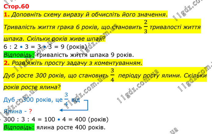 Доповніть схему виразу й обчисліть його значення. Тривалість життя грака 6 років, що становить 2/3 тривалості життя шпака. Скільки років живе шпак? 6 : 2 • 3 = 3 • 3 = 9 (років) Відповідь: тривалість життя шпака 9 років. 2. Розв'яжіть просту задачу з коментуванням. Дуб росте 300 років, що становить 3/4 періоду росту ялини. Скільки років росте ялина? Дуб – 300 років, це 3/4 від Ялина - ? 300 : 3 : 4 = 100 • 4 = 400 (років) Відповідь: ялина росте 400 років.