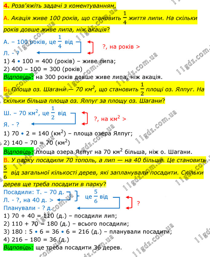 4. Розв'яжіть задачі з коментуванням. А. Акація живе 100 років, що становить 1/4 життя липи. На скільки років довше живе липа, ніж акація? А. – 100 років, це 1/4 від Л. - ? 1) 4 • 100 = 400 (років) – живе липа; 2) 400 – 100 = 300 (років) Відповідь: на 300 років довше живе липа, ніж акація. Б. Площа оз. Шагани — 70 км2, що становить 1/2 площі оз. Ялпуг. На скільки більша площа оз. Ялпуг за площу оз. Шагани? Ш. – 70 км2, це 1/2 від Я. - ? 1) 70 • 2 = 140 (км2) – площа озера Ялпуг; 2) 140 – 70 = 70 (км2) Відповідь: площа озера Ялпуг на 70 км2 більша, ніж о. Шагани. В. У парку посадили 70 тополь, а лип — на 40 більше. Це становить 5/6 від загальної кількості дерев, які запланували посадити. Скільки дерев ще треба посадити в парку? Посадили: Т. – 70 д. Л. - ?, на 40 д. > Планували - ? д. 1) 70 + 40 = 110 (д.) – посадили лип; 2) 110 + 70 = 180 (д.) – всього посадили; 3) 180 : 5 • 6 = 36 • 6 = 216 (д.) – планували посадити; 4) 216 – 180 = 36 (д.) Відповідь: ще треба посадити 36 дерев.