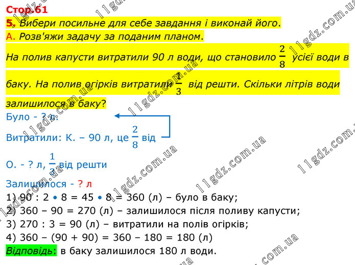 5. Вибери посильне для себе завдання і виконай його. А. Розв'яжи задачу за поданим планом. На полив капусти витратили 90 л води, що становило 2/8 усієї води в баку. На полив огірків витратили 1/3 від решти. Скільки літрів води залишилося в баку? Було - ? л. Витратили: К. – 90 л, це 2/8 від О. - ? л, 1/3 від решти Залишилося - ? л 1) 90 : 2 • 8 = 45 • 8 = 360 (л) – було в баку; 2) 360 – 90 = 270 (л) – залишилося після поливу капусти; 3) 270 : 3 = 90 (л) – витратили на полів огірків; 4) 360 – (90 + 90) = 360 – 180 = 180 (л) Відповідь: в баку залишилося 180 л води.