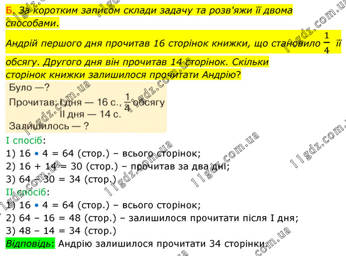 Б. За коротким записом склади задачу та розв'яжи її двома способами. Андрій першого дня прочитав 16 сторінок книжки, що становило 1/4 її обсягу. Другого дня він прочитав 14 сторінок. Скільки сторінок книжки залишилося прочитати Андрію? І спосіб: 1) 16 • 4 = 64 (стор.) – всього сторінок; 2) 16 + 14 = 30 (стор.) – прочитав за два дні; 3) 64 – 30 = 34 (стор.) ІІ спосіб: 1) 16 • 4 = 64 (стор.) – всього сторінок; 2) 64 – 16 = 48 (стор.) – залишилося прочитати після І дня; 3) 48 – 14 = 34 (стор.) Відповідь: Андрію залишилося прочитати 34 сторінки.