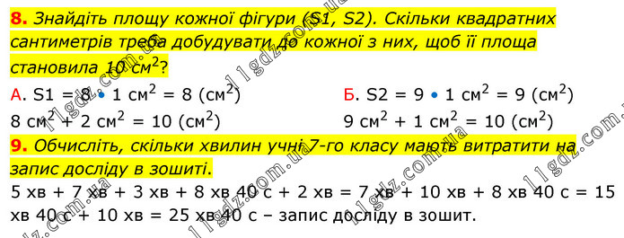 8. Знайдіть площу кожної фігури (S1, S2). Скільки квадратних сантиметрів треба добудувати до кожної з них, щоб її площа становила 10 см2? А. S1 = 8 • 1 см2 = 8 (см2) 8 см2 + 2 см2 = 10 (см2) Б. S2 = 9 • 1 см2 = 9 (см2) 9 см2 + 1 см2 = 10 (см2) 9. Обчисліть, скільки хвилин учні 7-го класу мають витратити на запис досліду в зошиті. 5 хв + 7 хв + 3 хв + 8 хв 40 с + 2 хв = 7 хв + 10 хв + 8 хв 40 с = 15 хв 40 с + 10 хв = 25 хв 40 с – запис досліду в зошит.